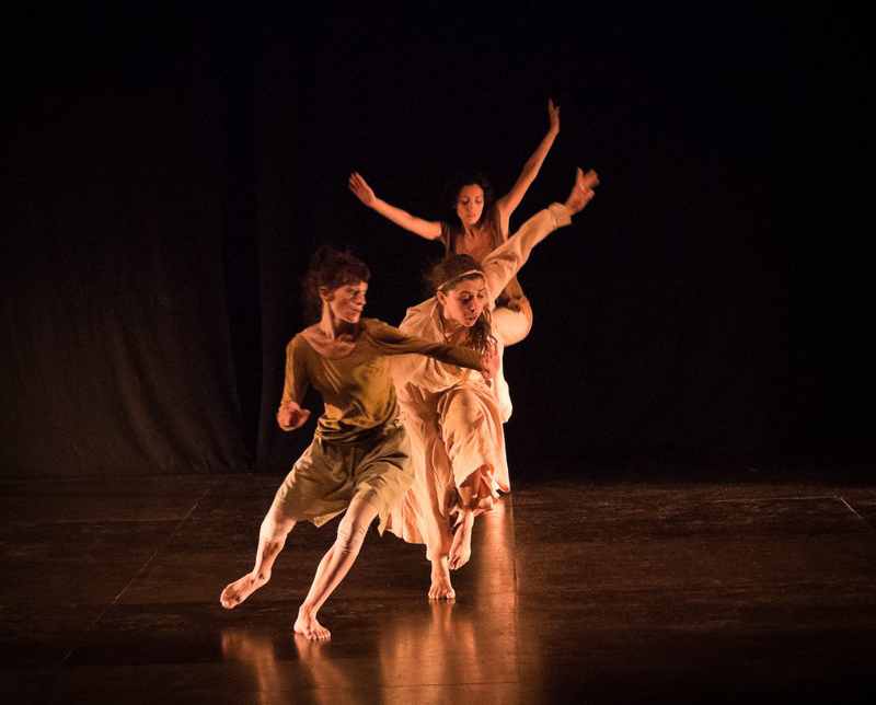 La scena scarna, priva di qualunque orpello, non è mai vuota. Le quattro danzatrici tagliano e disegnano lo spazio secondo formule sempre nuove, oppure ripetono iterazioni accattivanti, ed in quei rari momenti in cui non sono presenti in scena in formazione completa ci pensa il disegno luci ad impegnare lo sguardo con colorazioni dalla forte implicazione emozionale. Il blu ed il giallo-rosa si incastrano spesso, ad ispirare l’icona più primaria dell’acqua da cui provengono gli sbarchi e della sabbia su cui approdano perigliosamente. Ma è soprattutto la dialettica di tagli, frontalità e controluce a disporre il susseguirsi dei quadri secondo un incedere di qualità drammaturgica, in cui il colore partecipa come linguaggio tra i linguaggi.